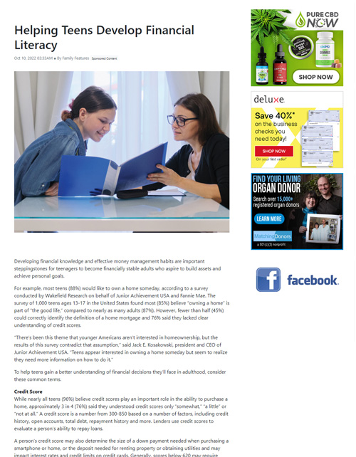 Create an unformatted piece of content that connects with teenagers and their parents to form a foundation for financial literacy while highlighting homeownership as an example and citing survey statistics throughout. Syndicate content to print and digital publications using both earned and paid tactics.